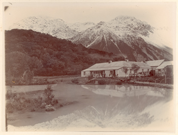 Alpi meridionali della Nuova Zelanda: Borsalino, Zurbrigghen e altri davanti ad  un edificio in lamiera sulle sponde di uno specchio d'acqua